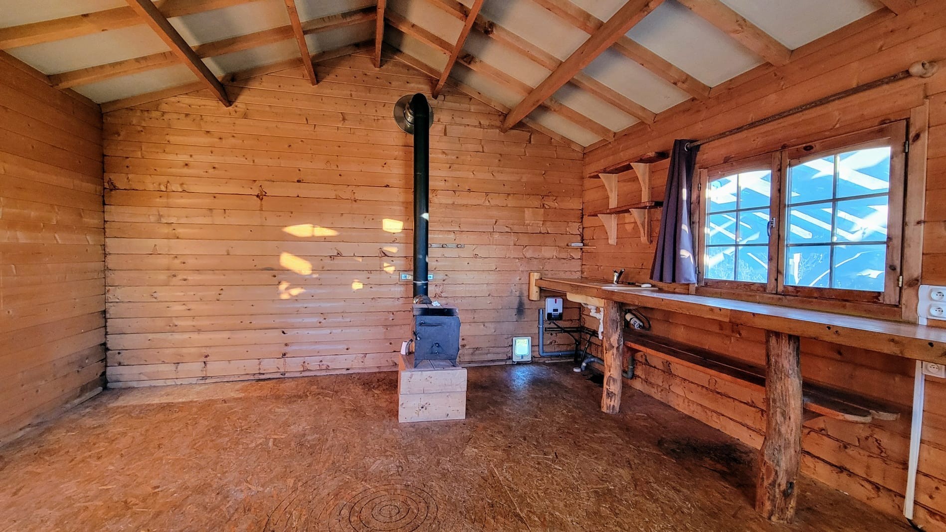 Le chalet est raccordé à l’eau, à l’électricité et chauffé par un poêle à bois.