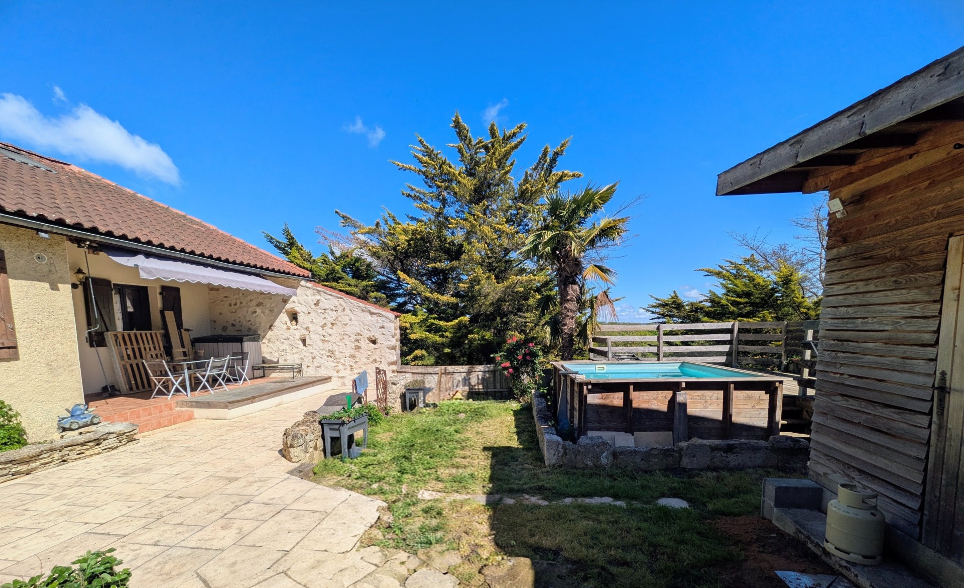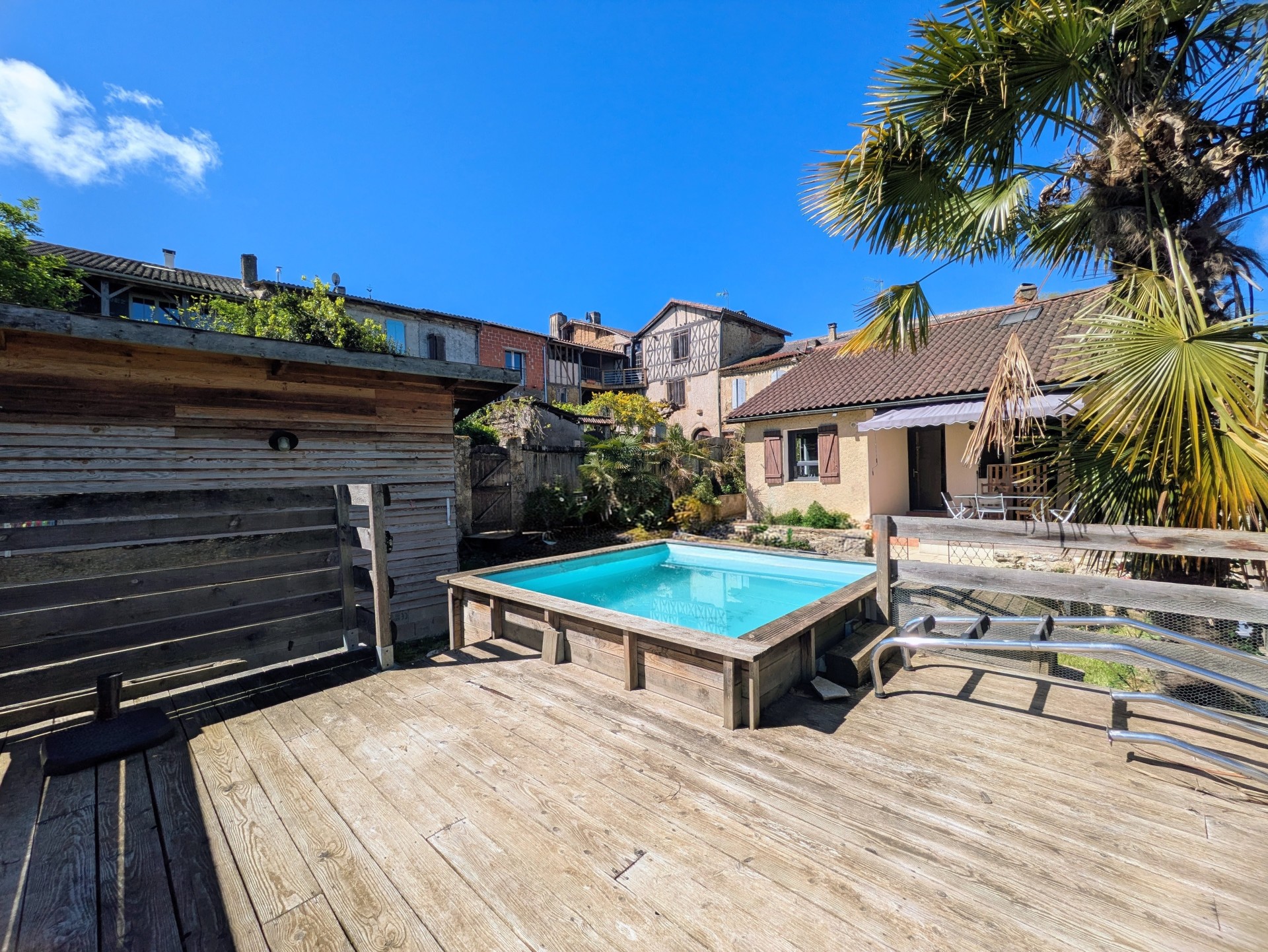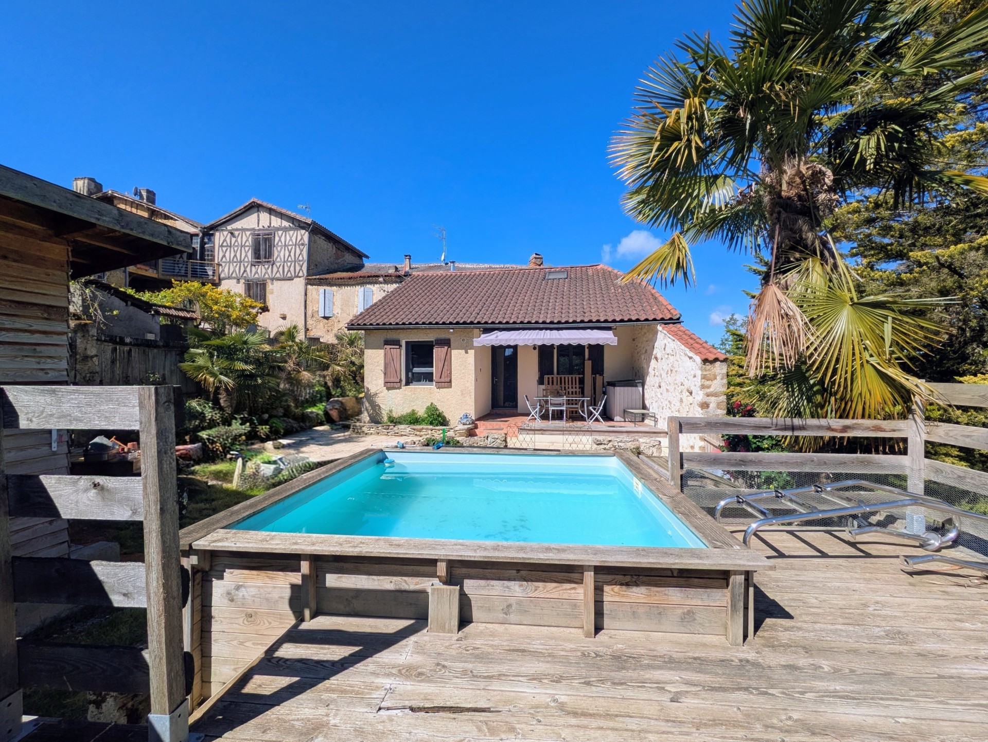 À l’extérieur, vous profiterez d’un joli jardin d’environ 200 m² avec abri de jardin, facilement transformable en garage et une petite piscine hors sol d’où on profite d’une vue dégagée sur la campagne et le donjon de Bassoues.