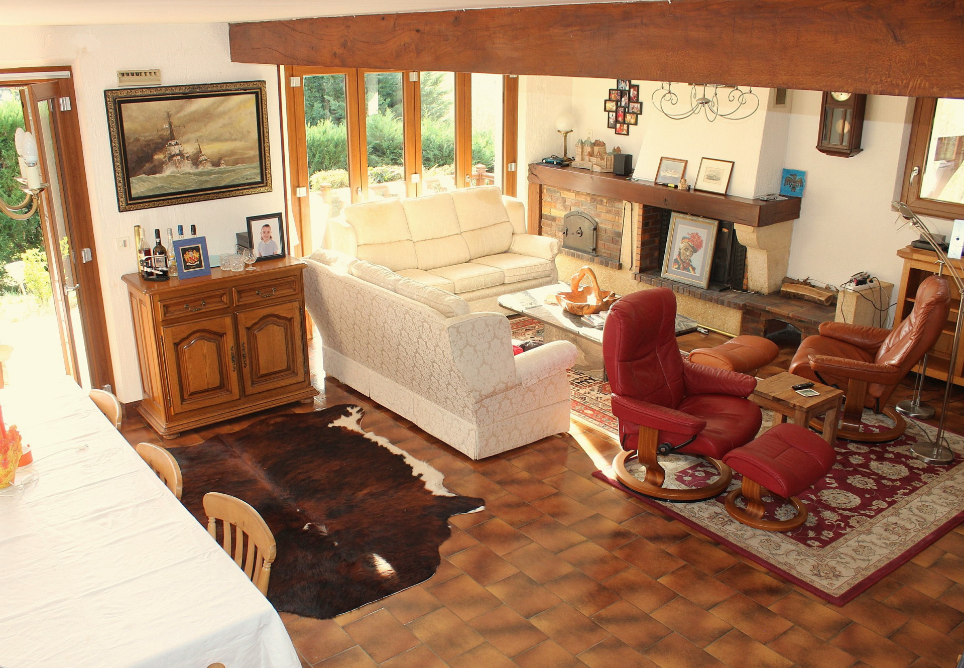 En rez de chaussée, double séjour de 43m2 avec cheminée équipée d'un insert, éclairée par deux grandes baies vitrées repliables, donnant accès à la terrasse plein sud et à la piscine. La cuisine récente donne également sur la terrasse. Le cellier à l'arrière ouvre sur l'escalier menant au garage. Une chambre avec sa salle d'eau et son dressing, ainsi qu'un wc séparé, complètent ce niveau.