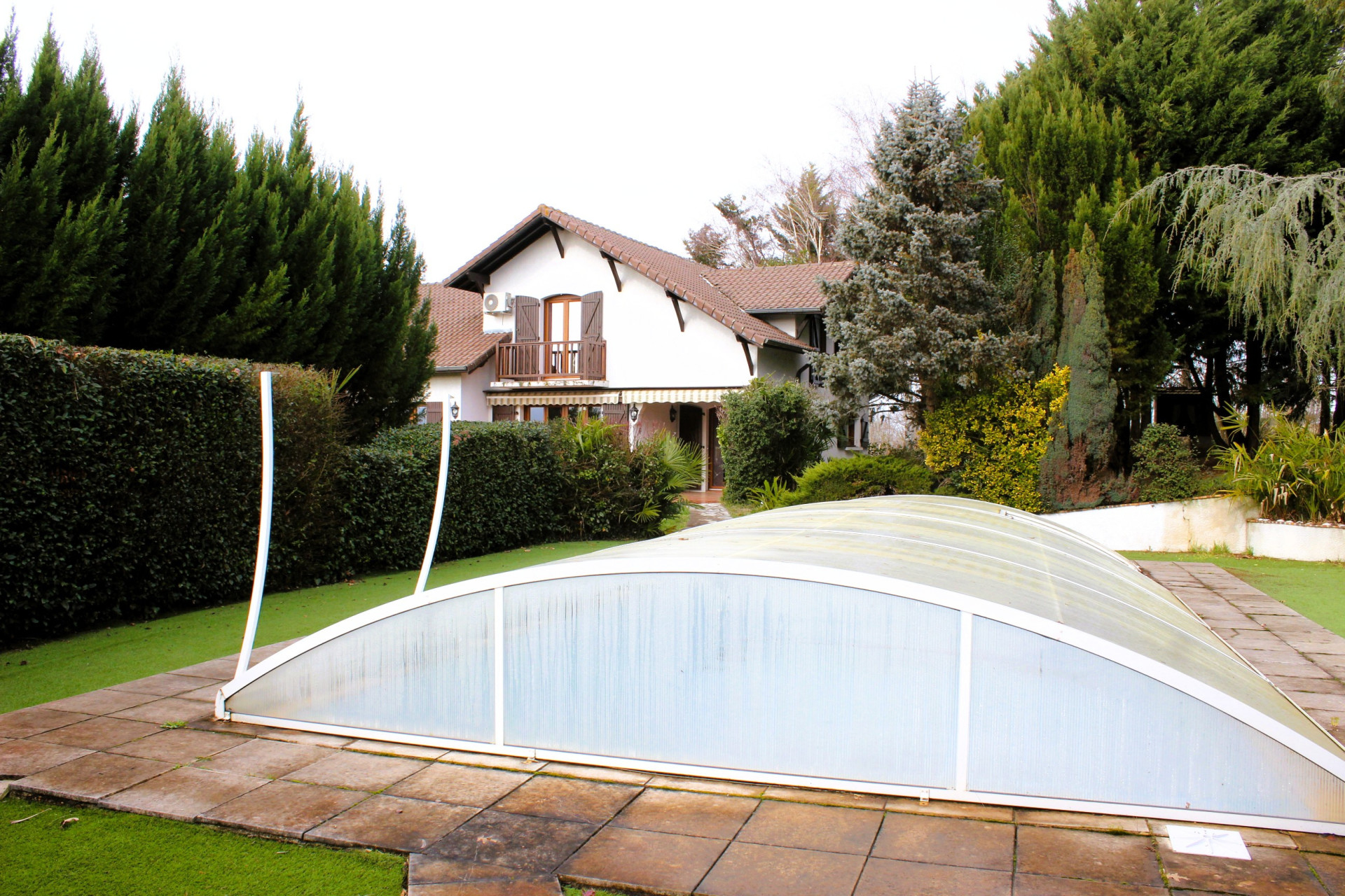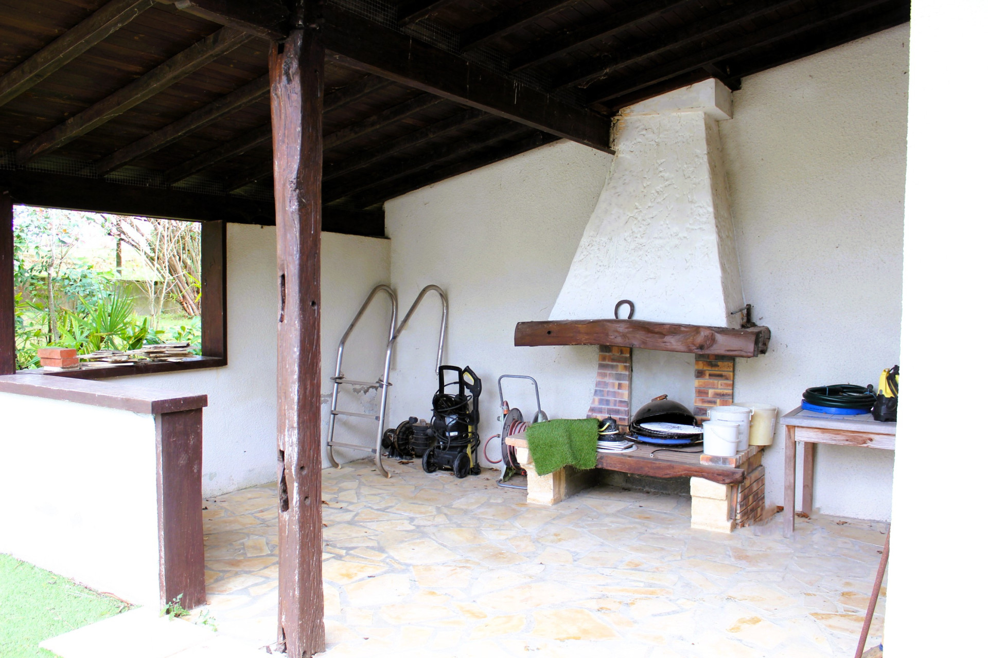 La piscine 10 x 5 est couverte avec des arceaux coulissants. Elle est vide actuellement et nécessitera quelques travaux de remise en état. Le pool house comprend une petite pièce technique abritant les moteurs (au sel) , ainsi qu'une douche, et sa terrasse couverte est équipée d'une grande cheminée pour le barbecue.