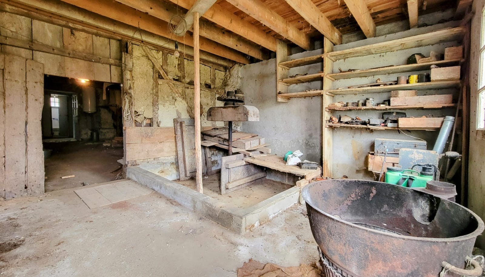 A l’arrière de la maison, l’ancien chai offre un réel potentiel d’aménagement. A noter, la conservation du pressoir et du four à pain.