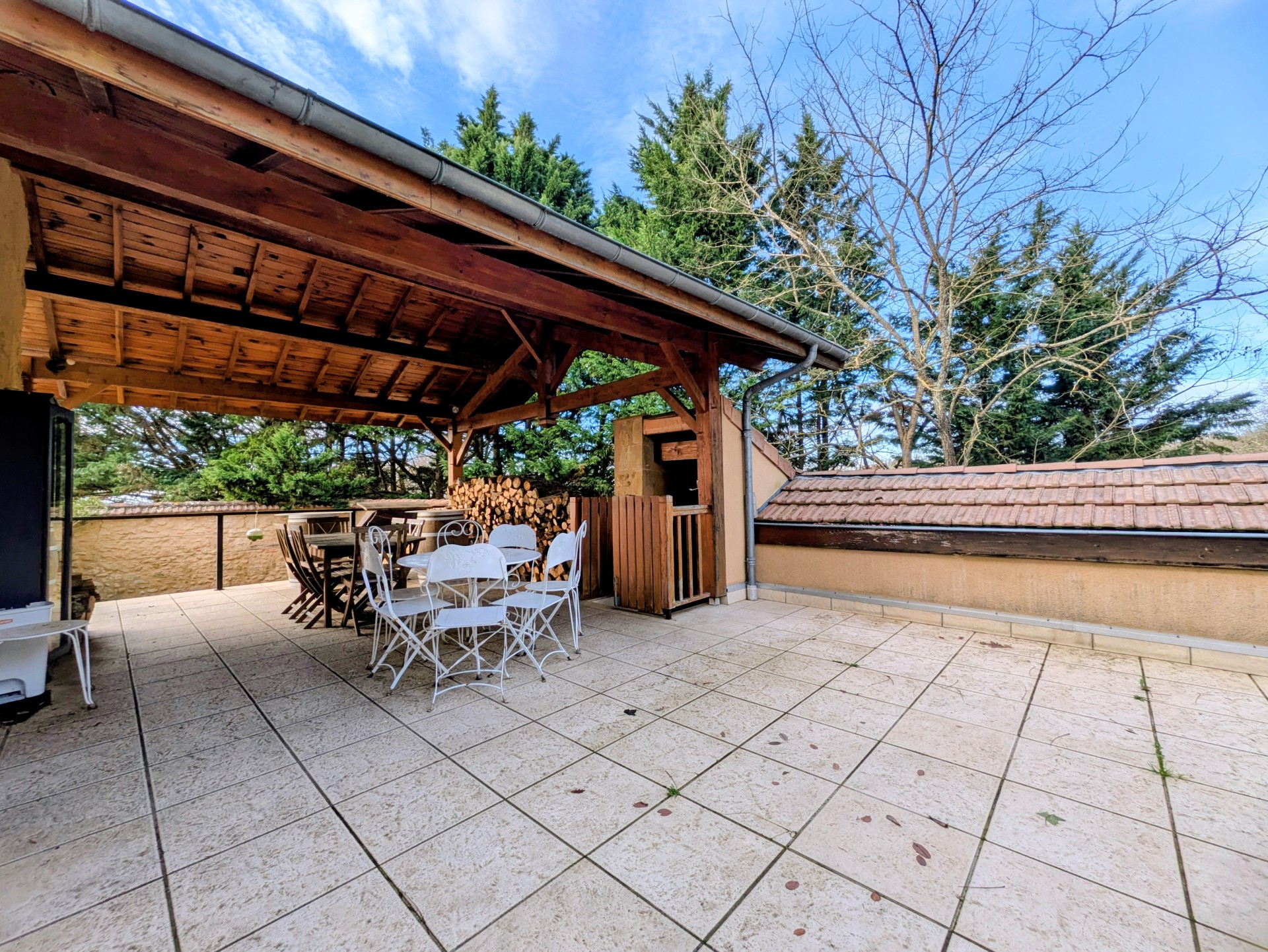 Les espaces de vie s’ouvrent sur une grande terrasse couverte au nord. On profitera d’une seconde terrasse en bois, non couverte, attenante à la maison, où se trouve la piscine au sel sécurisée. Une chaufferie, un double garage et une cave en sous-sol complètent le bien.