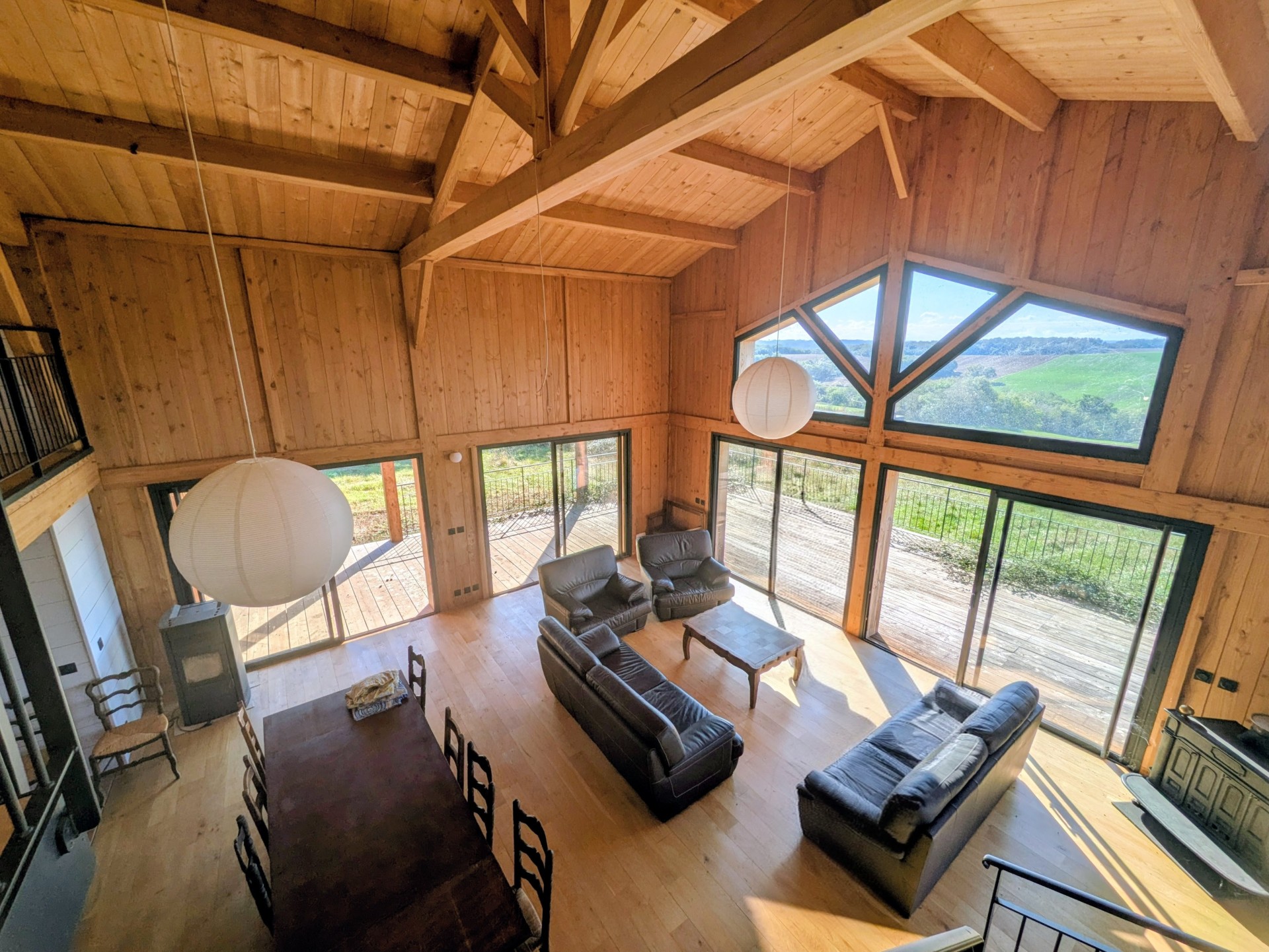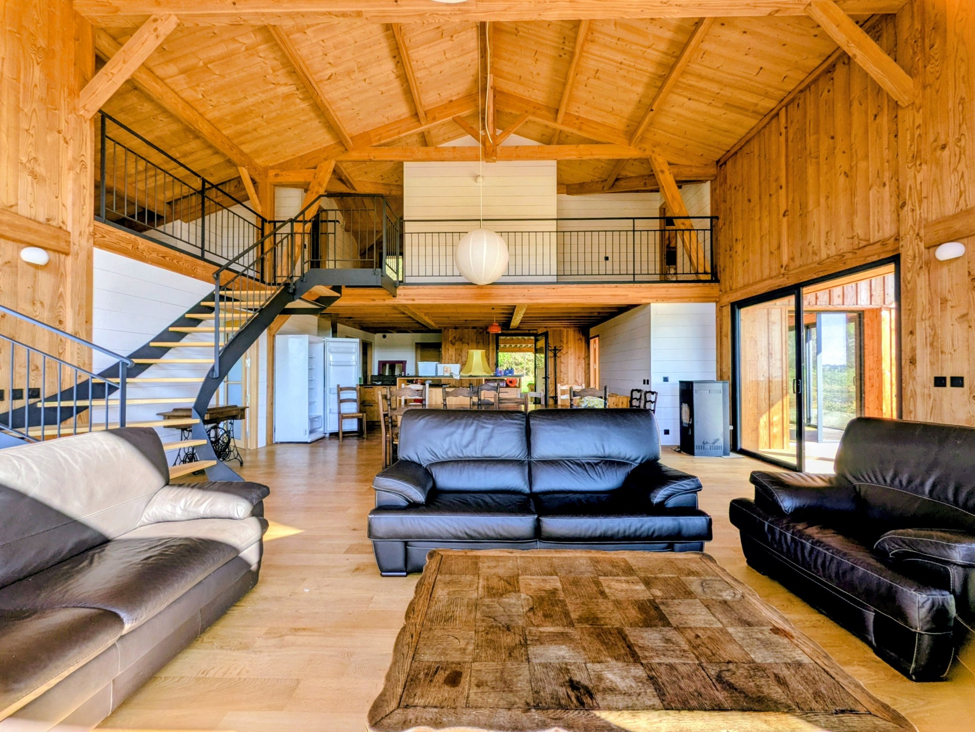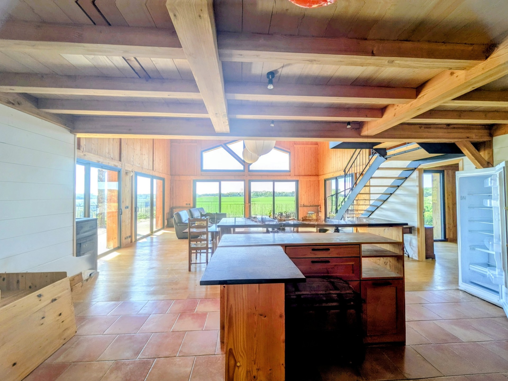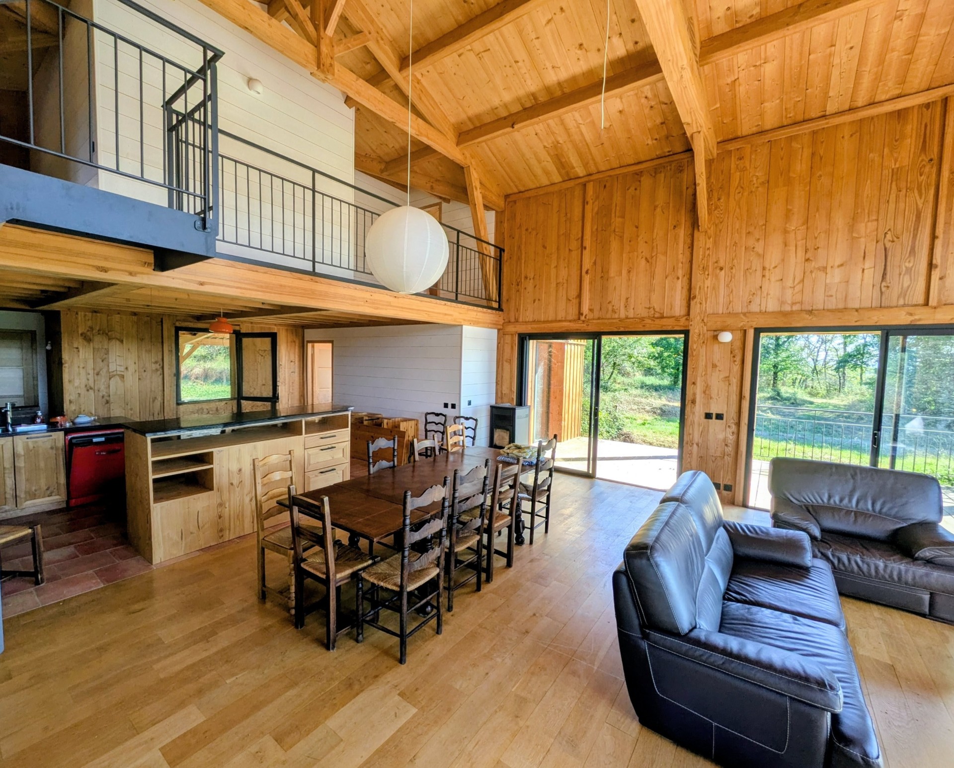 D’une superficie d’environ 190 m², elle offre une pièce de vie spacieuse et lumineuse avec toit cathédrale et charpente traditionnelle apparente, ouverte sur une grande terrasse en bois exposée plein sud.