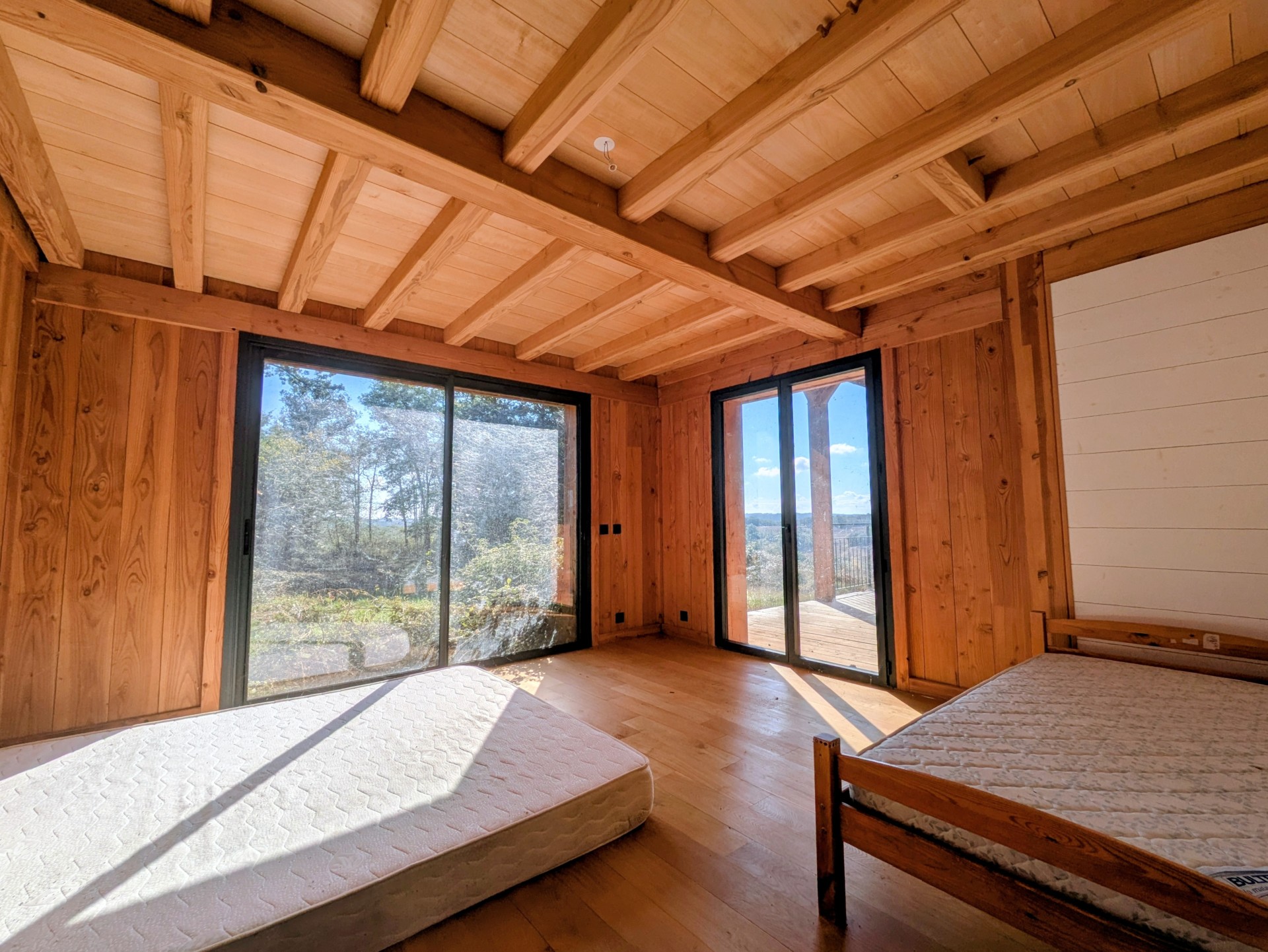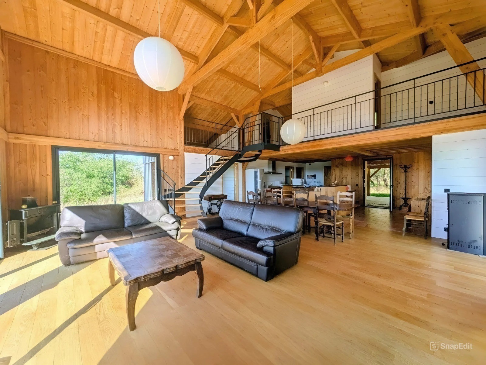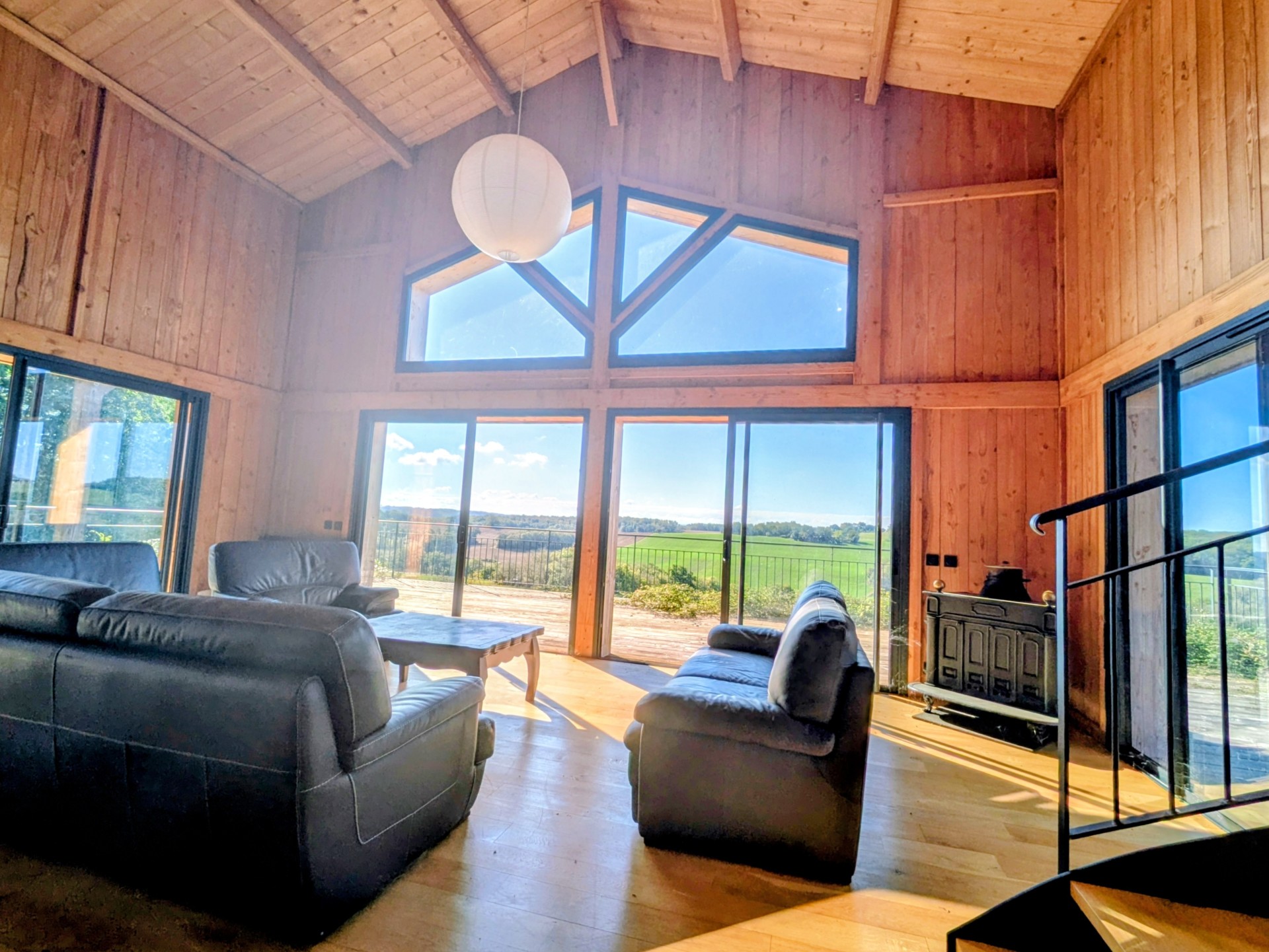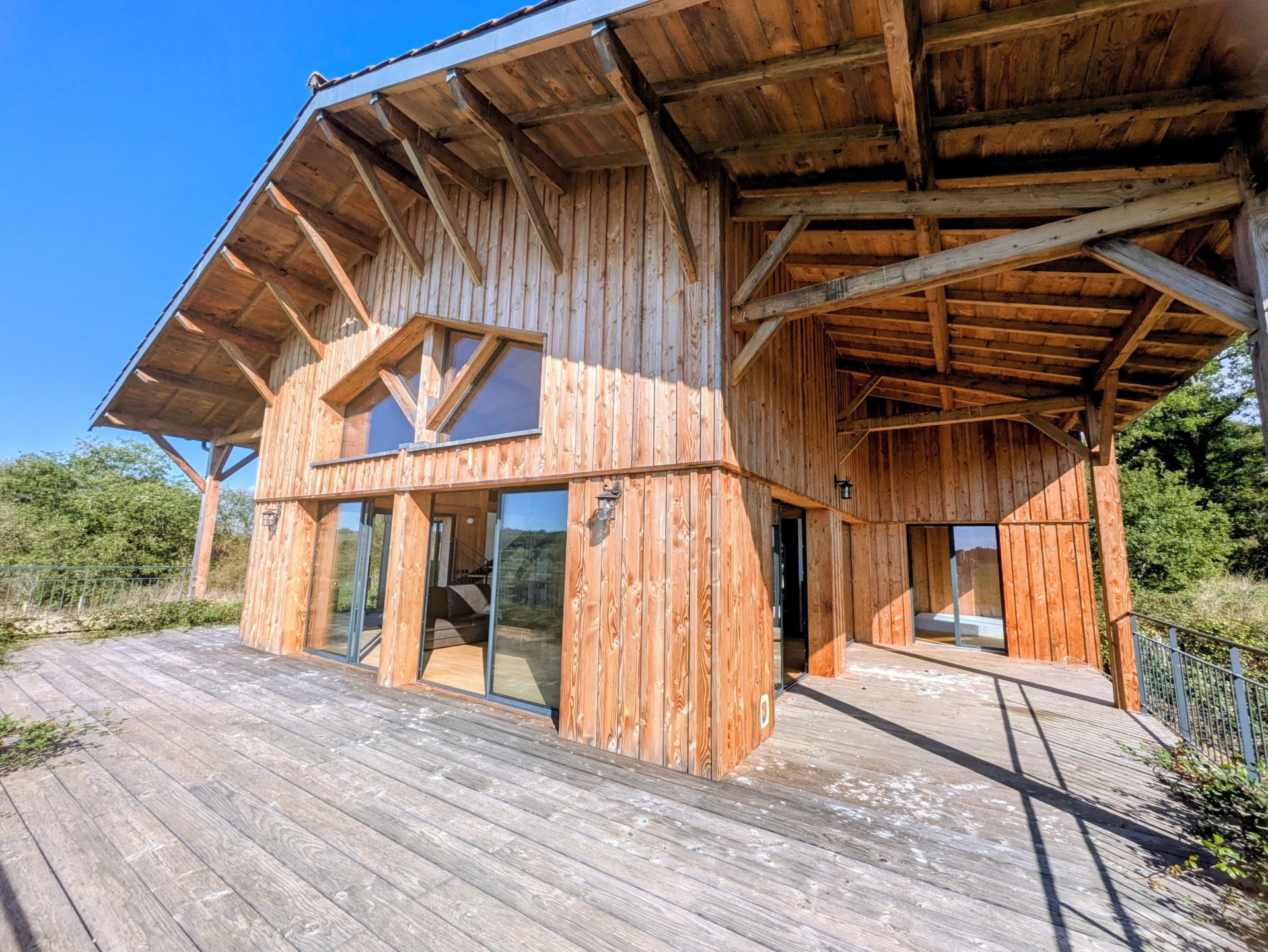 D’une superficie d’environ 190 m², elle offre une pièce de vie spacieuse et lumineuse avec toit cathédrale et charpente traditionnelle apparente, ouverte sur une grande terrasse en bois exposée plein sud.