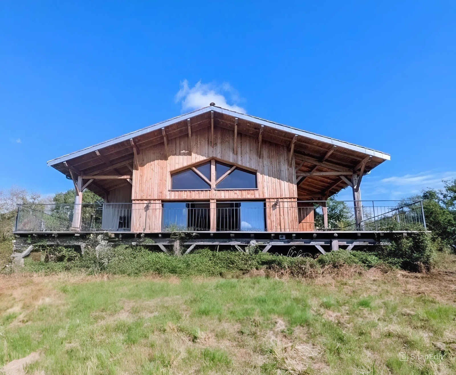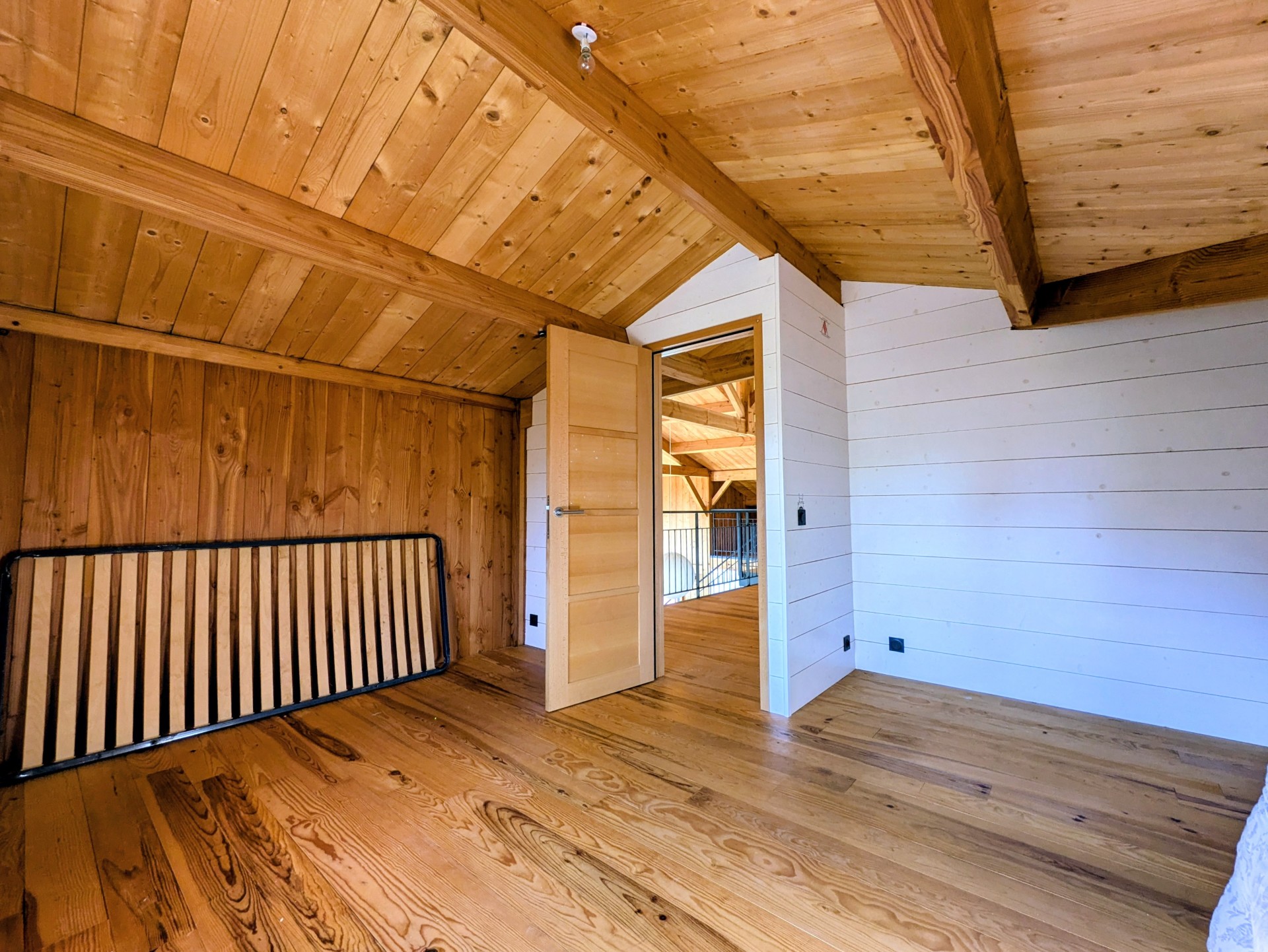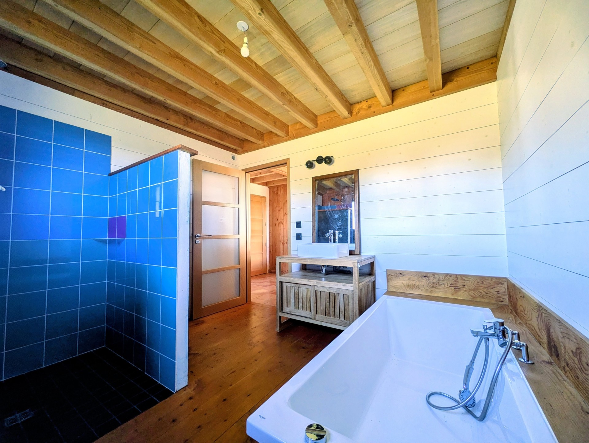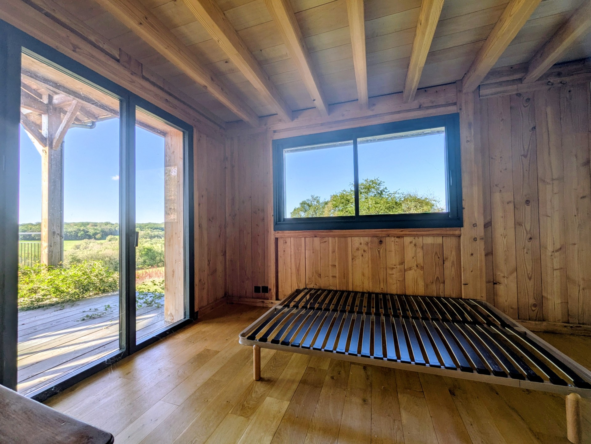 D’une superficie d’environ 190 m², elle offre une pièce de vie spacieuse et lumineuse avec toit cathédrale et charpente traditionnelle apparente, ouverte sur une grande terrasse en bois exposée plein sud.
